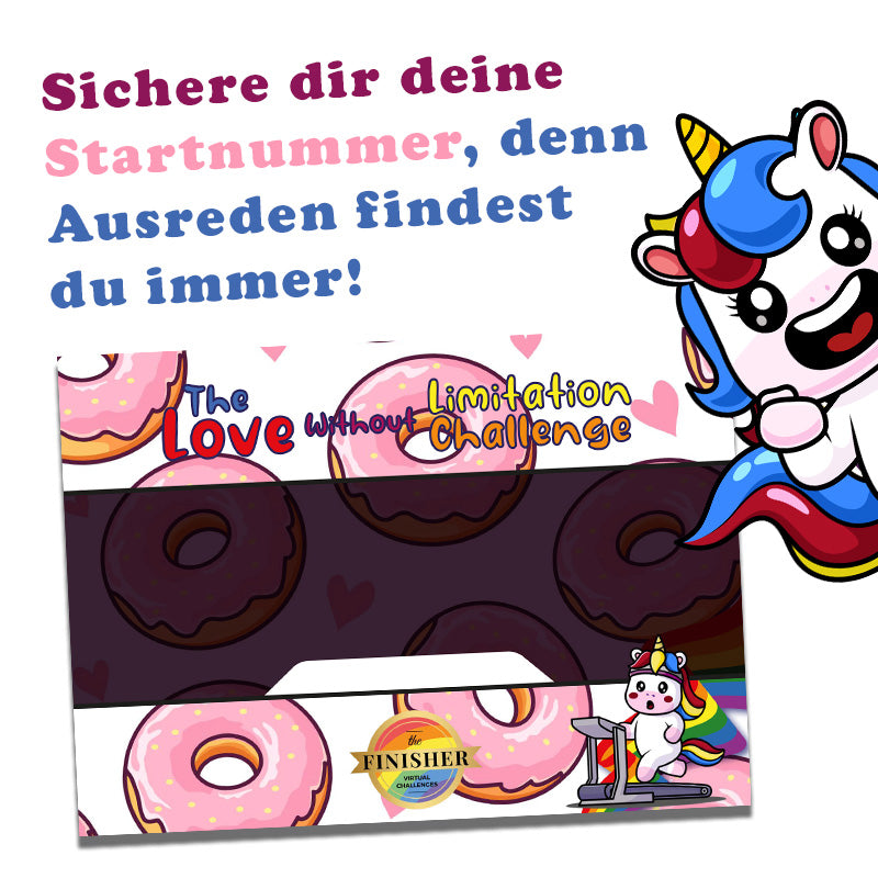Für Vielfalt und Respekt tretet ihr bei dieser Challenge an, denn alle Menschen verdienen es glücklich zu sein und so zu sein, wie sie sind, ganz ohne Grenzen! Auch ihr seid perfekt, genauso wie ihr seid. Mit einem aufgeschlossenen Herzen nehmt ihr an der „The Love without Limitation“-Challenge teil. Ob Walken, Laufen oder Radfahren, lasst euer Gefühl entscheiden. Meistere deine Challenge im Zeichen der Liebe und der Akzeptanz. Fordere dich heraus und setze dir dein persönliches Ziel, du hast die Wahl aus fünf Distanzen. Schreite durch das Ziel und erhalte die „The Love without Limitation“-Urkunde und deine einzigartige FINISHER-Medaille in der hochwertigen FINISHER-Box. Für JEDE Teilnahme an der virtuellen „The Love without Limitation“-Challenge spenden wir 5€ an einen großen Verband mit Sitz in Köln, welcher sich mit großer Motivation und Einsatzbereitschaft vielen LGBTIQA+ Schwerpunkten widmet. CARE FOR YOURSELF & CARE FOR THE WORLD!